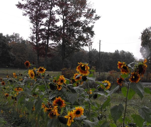 (Helianthus annuus) Annual multiple headed sunflower with rich dark center and golden yellow periphery. Six to eight feet tall.