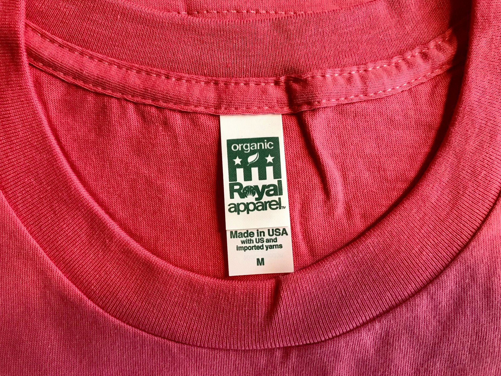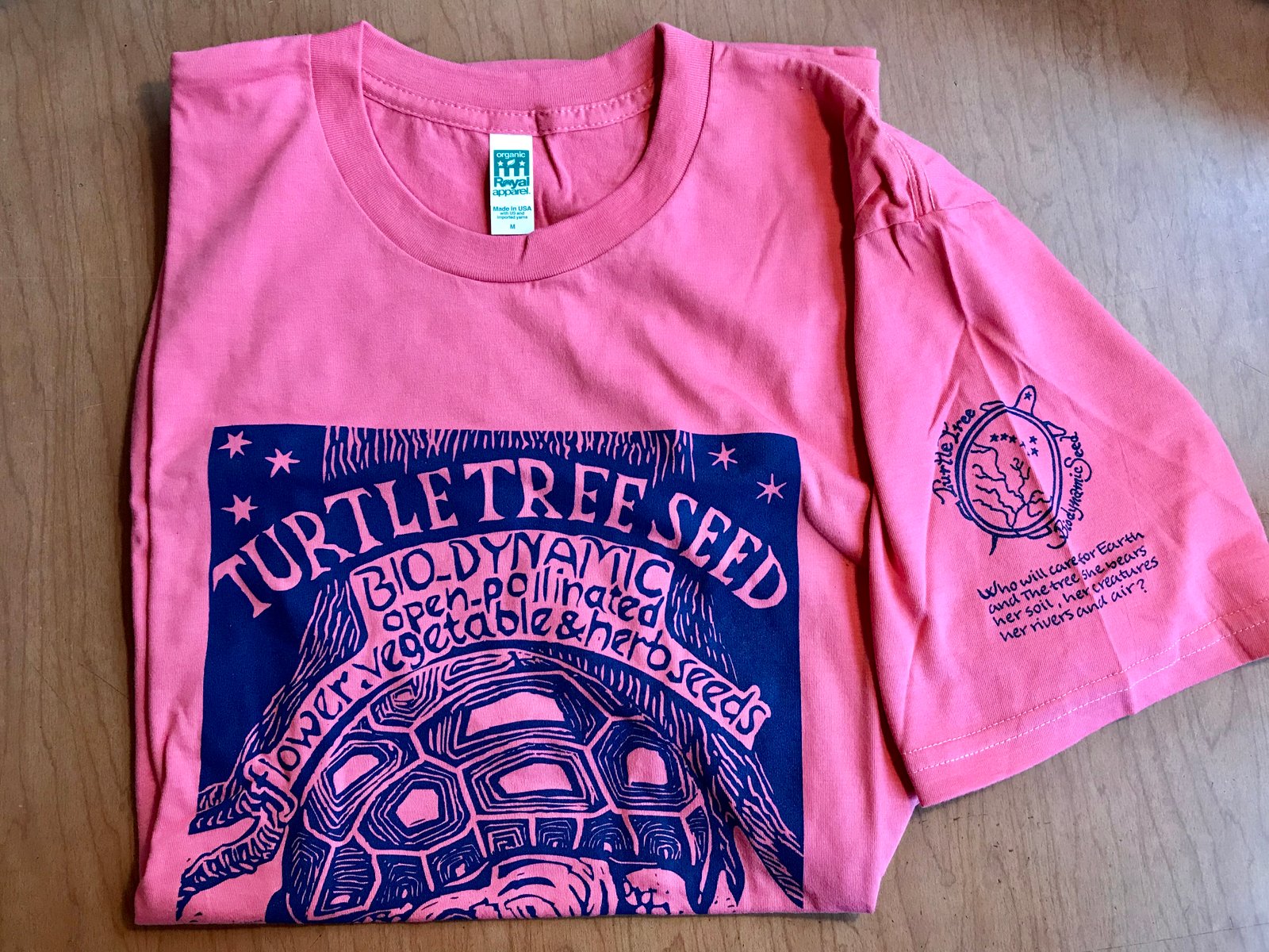 Coral pink. Turtle Tree logo printed on front, Turtle-Big Dipper-Mississippi logo with poem on left sleeve. 100% Organic cotton from Royal Apparel. Made in USA.