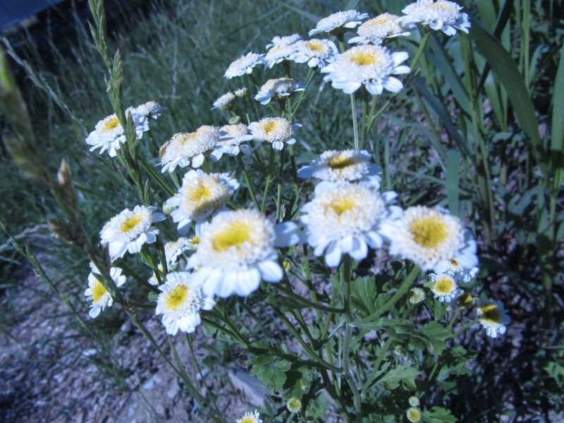 (Tanacetum parthenium) Perennial. 24-36 in. plants with attractive clusters of small 1/2 inch white to cream colored daisy-like flowers are long-lasting in flower arrangements, pungent chrysanthemum-like aroma. Used medicinally to break fevers, for menstrual cramps and migraine headaches. Very helpful bitter herb.