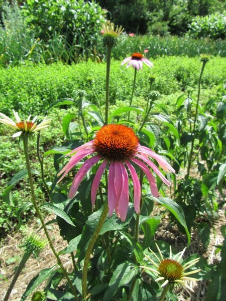 (Purple Coneflower) HEIRLOOM. Native of the mid-western prairies of the United States. Hardy perennial. 36 in. tall plants bear large 4 in. daisy-type flowers with prominent cone-like dark centers that have orange tips which look stunning with the lavender-pink petals. A tincture or tea of the roots strengthens the immune system.