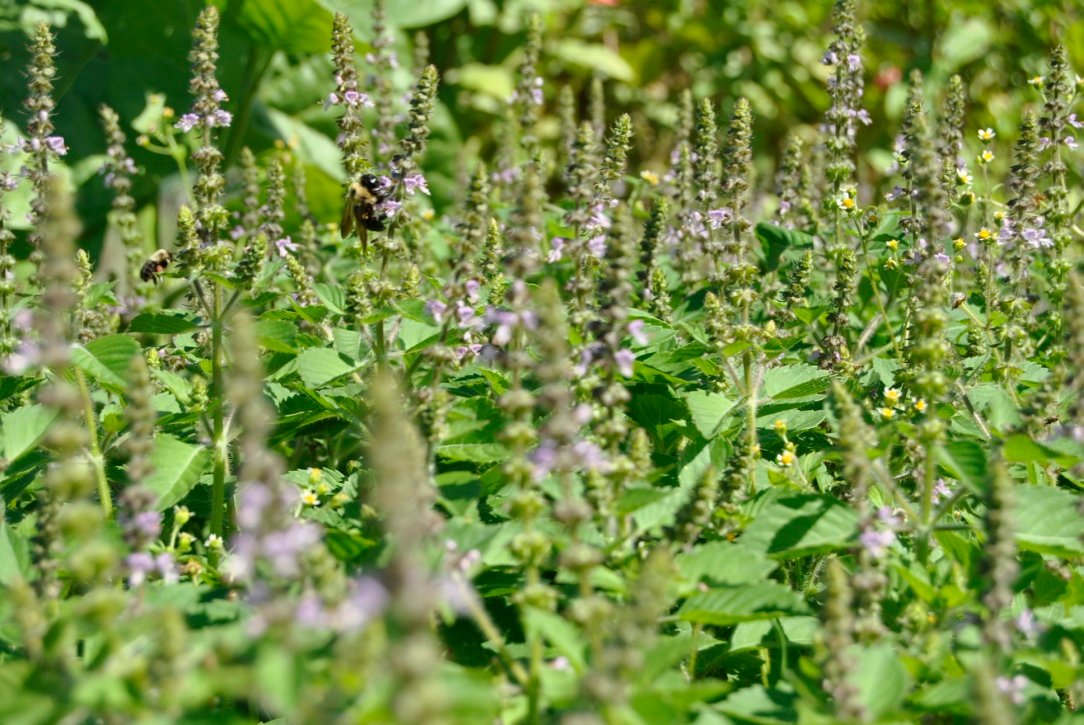 Harvest leaves as you need them for cooking or tea. For dried leaves to save and use throughout the winter months, harvest the stalk from where it emerges at the stem at flowering stage or slightly before and hang upside-down in a dry area with ample circulation. (If frost is upon you, cut the entire plant at the base and hang to dry! Otherwise, harvesting branch by branch will encourage the plant to produce new growth.)