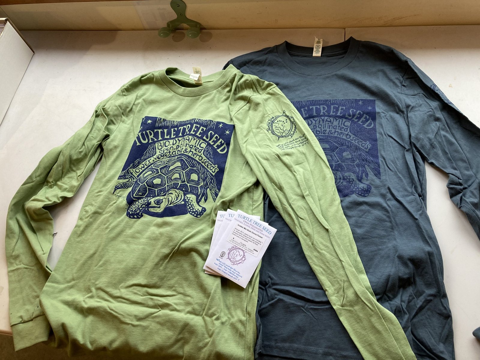 NEW Color and NEW Style! Super soft, avocado green long sleeve 100% cotton T-shirt. Like our other Tees – the Turtle Tree wood cut logo is on the front, with our Big Dipper-Mississippi Turtle logo with poem on the left sleeve.