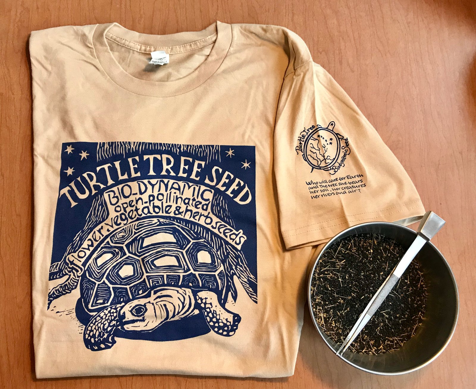 Mushroom light brown in small size only. Turtle Tree logo printed on front, Turtle-Big Dipper-Mississippi logo with poem on left sleeve. 100% Organic cotton from Royal Apparel. Made in USA.