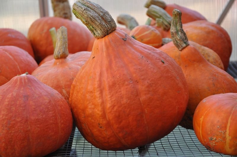 (C. maxima) Beautiful red-orange skin. 5 lb tear-drop shaped fruits make a colorful addition to the autumn harvest. This smooth sweet flesh is great baked for pies. Skin is less tough than most squashes so there is no need to peel it when making pureed squash soup!