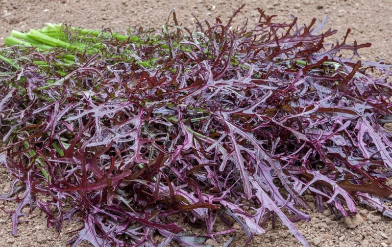 Brassica juncea Frilly deep purple-red mustard, excellent for salad mixes, and all cool weather cultivation, both in the field and in hoops, coldframes and greenhouses.