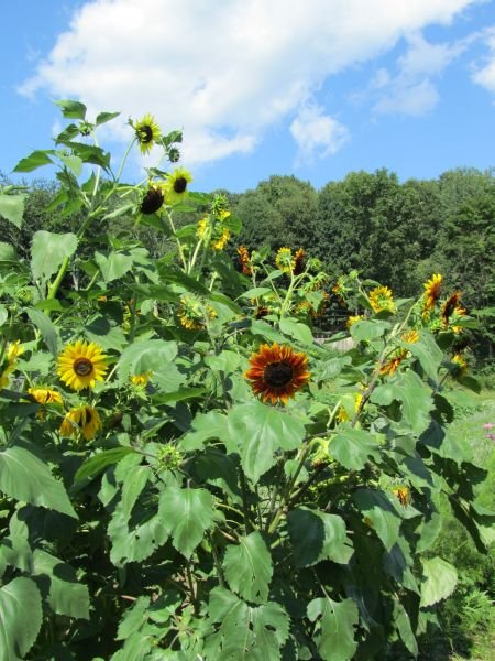 (Helianthus annuus) Annual. Colorful mix of multi-headed, multi-colored sunflowers.